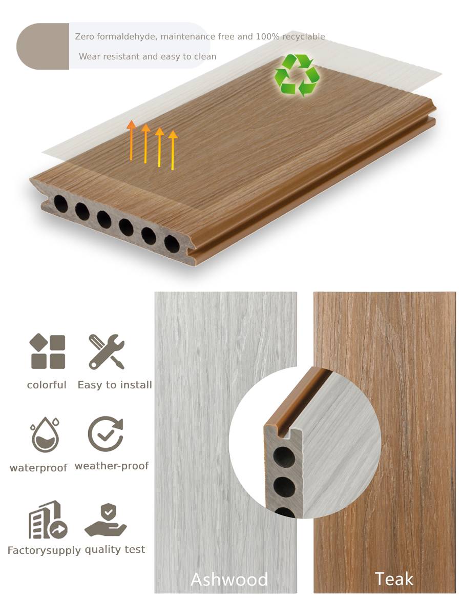 Two-color decking is the latest generation of co-extruded wood plastic composite (WPC). In contrast to traditional co-extruded wood-plastic products, two-tone decking offers a variety of colors on both surfaces, creating a wood-like texture.